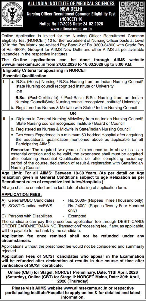 Candidates who meet the eligibility criteria, possessing a B.Sc in Nursing, a Post Basic B.Sc in Nursing, or a Diploma in General Nursing and Midwifery (GNM) along with the necessary experience, are encouraged to thoroughly review the detailed notification prior to submitting their online application. The online registration process for AIIMS NORCET 10 2026 will commence on 24th February 2026 and will conclude on 16th March 2026 at 05:00 PM.
