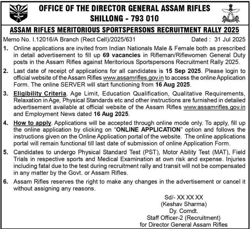 The Assam Rifles has released the 2025 Sports Quota Recruitment Notification for 69 vacancies. The Director General of Assam Rifles, located in Shillong, is inviting online applications from qualified Indian Nationals (both Male and Female) for 69 Rifleman/Riflewoman General Duty positions as part of the Meritorious Sportspersons Recruitment Rally 2025. Interested individuals can submit their applications online via the official Assam Rifles website from August 16, 2025, to September 15, 2025.