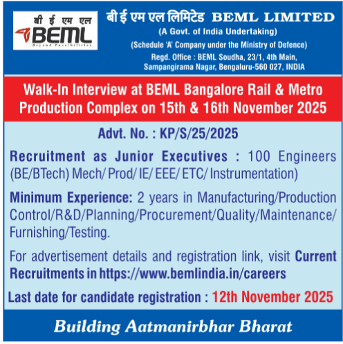 - Step 3: Participate in the Walk-in Interview at the BEML Bangalore Rail & Metro Production Complex on 15th and 16th November 2025.
