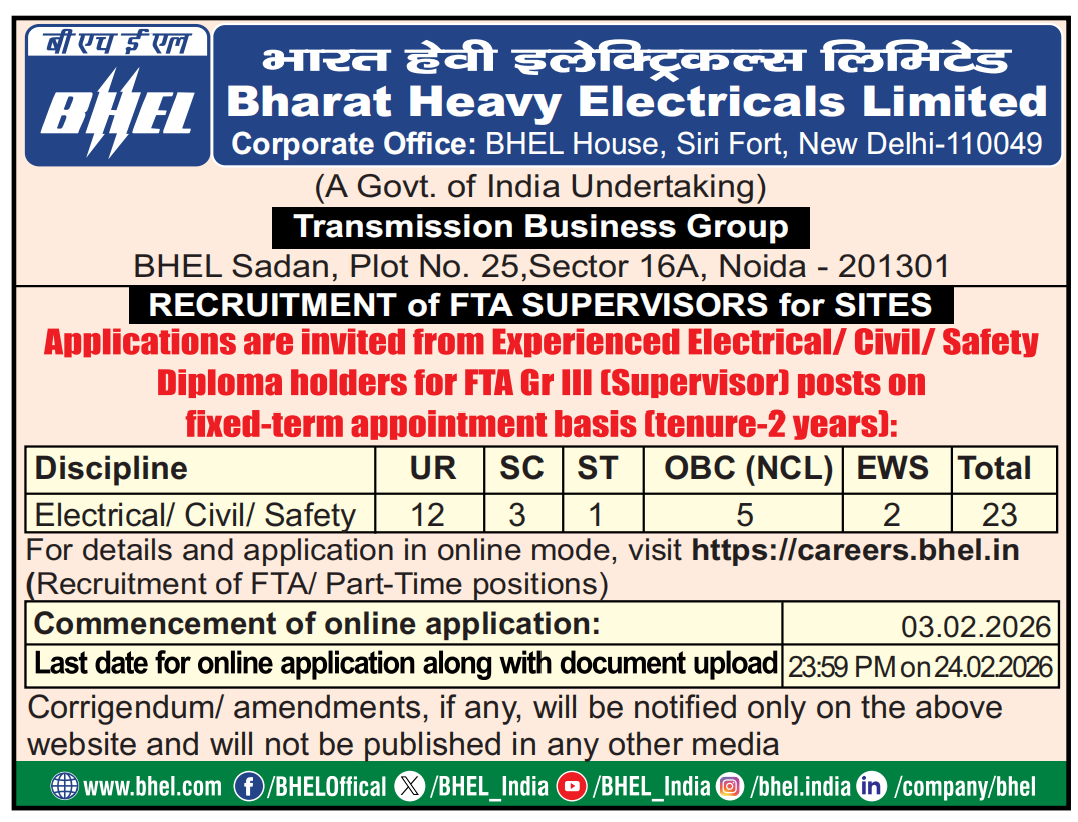 Bharat Heavy Electricals Limited (BHEL), Transmission Business Group is seeking online applications from qualified Diploma holders in the fields of Electrical, Civil, and Safety for the position of FTA (Fixed Tenure Appointment) Supervisors (Grade III) on a fixed-term basis for a duration of 2 years. The BHEL FTA Supervisor Recruitment 2026 is for 23 positions. The online application process and document upload will commence on 03rd February 2026 and will conclude on 24th February 2026 at 23:59 Hrs.