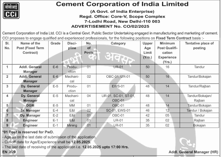 Interested in applying for Cement Corporation of India Limited (CCI) Recruitment 2025: Apply for Engineer and Manager. The Posts are for the qualified and experienced individuals for the recruitment of several managerial and engineering positions on a fixed-term contract basis. The deadline for submitting applications is May 12, 2025.