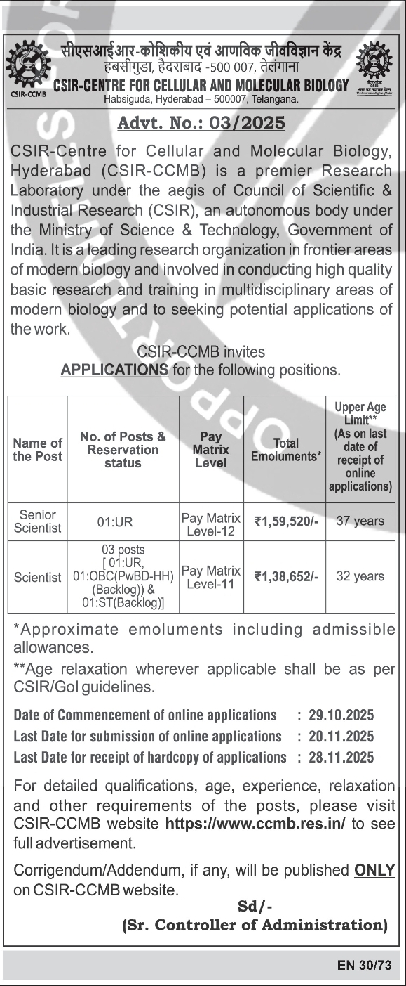CSIR-Centre for Cellular and Molecular Biology (CSIR-CCMB) in Hyderabad Recruitment 2025