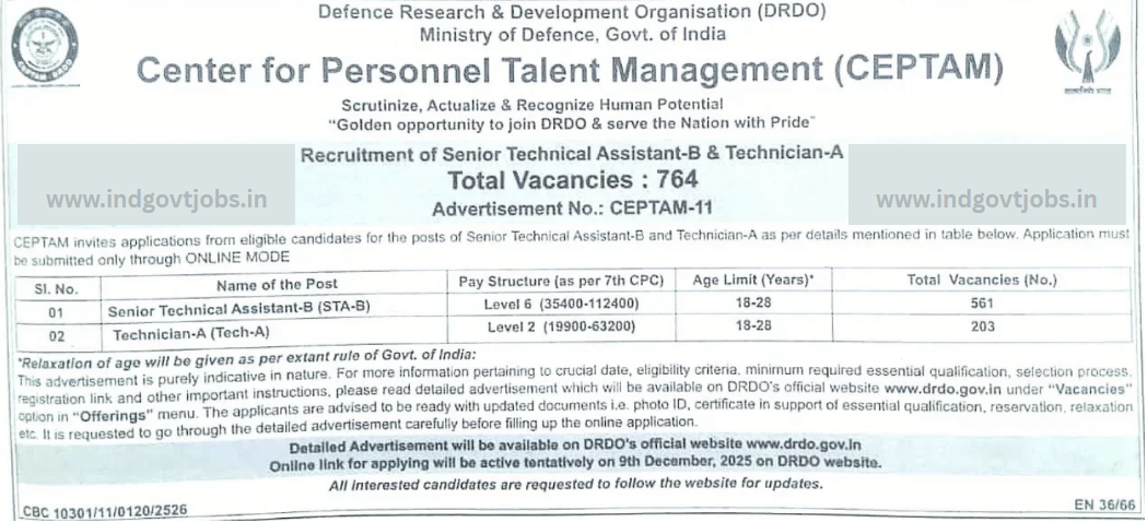 The Centre for Personnel Talent Management (CEPTAM) of the Defence Research and Development Organisation (DRDO) has published the highly anticipated Advertisement No. CEPTAM-11 for the recruitment of 764 Group-B and Group-C positions, specifically for Senior Technical Assistant-B (STA-B) and Technician-A (Tech-A) across multiple disciplines.