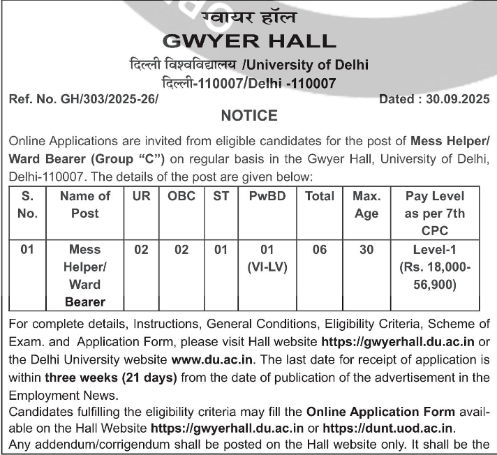 The Gwyer Hall at the University of Delhi is inviting online applications from qualified Indian citizens for the direct recruitment of Mess Helper/Ward Bearer (Group “C”) positions on a regular basis. This recruitment is intended to fill vital support roles within the hostel operations at Gwyer Hall, Delhi-110007. The Gwyer Hall DU Vacancy 2025 Notification was released in the Employment Newspaper on 18th October 2025, and the online application form will be accessible from 30th September to 6th November 2025. Interested and eligible candidates are advised to thoroughly review the detailed notification prior to completing the application form.
