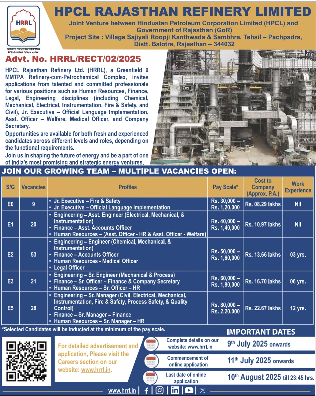 HPCL Rajasthan Refinery Limited (HRRL), a collaboration between Hindustan Petroleum Corporation Limited (HPCL) and the Government of Rajasthan, has issued a recruitment announcement (Advt. No. HRRL/Rect/02/2025) for 131 openings in Engineering, Junior Executive, HR, Finance, and Legal roles. The online application period will be available from July 11, 2025, to August 10, 2025.