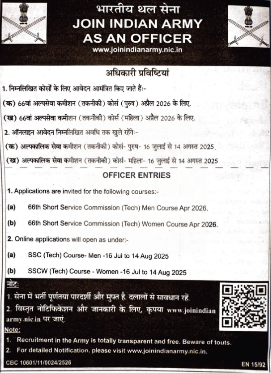 The Indian Army is calling for online applications from qualified unmarried Male and Female Engineering Graduates for the 66th Short Service Commission (Tech) Men Course and the 66th Short Service Commission (Tech) Women Course, which will begin in April 2026. This recruitment initiative seeks to fill over 379 vacancies. The online registration period will run from 16th July 2025 to 14th August 2025.