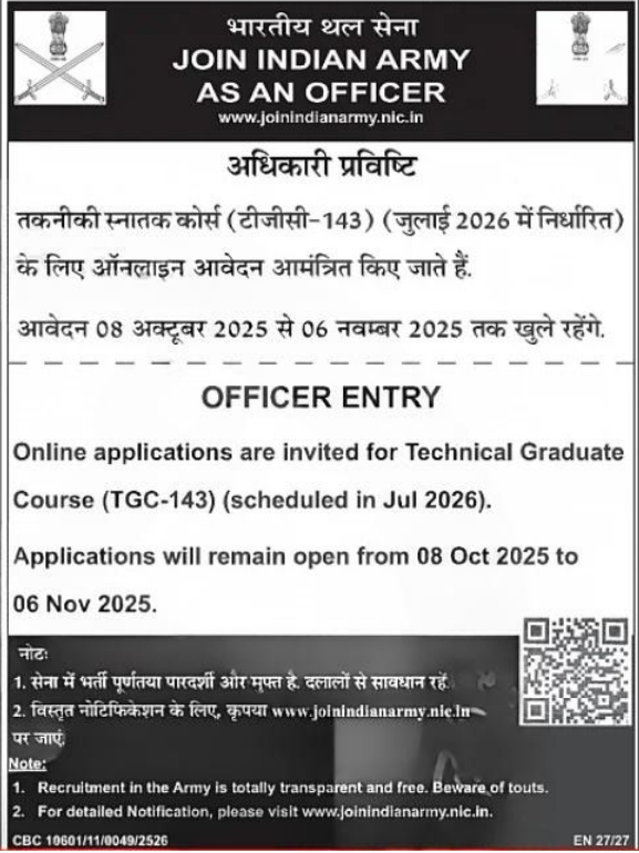 Indian Army TGC 143 Notification for Over 30 Engineering Positions in 2025-26: The Indian Army is calling for online applications from qualified unmarried Male Engineering Graduates for the 143rd Technical Graduate Course (TGC-143) set to begin in July 2026 at the Indian Military Academy (IMA) in Dehradun, leading to a Permanent Commission in the Indian Army. The online registration for Indian Army TGC 143 will commence on 8th October and conclude on 6th November 2025.