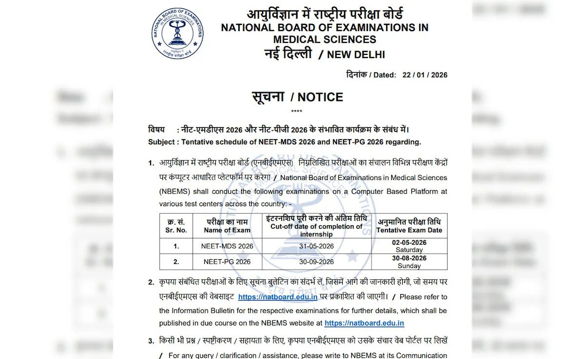 The National Board of Examinations in Medical Sciences (NBEMS) has today announced the provisional timetable for NEET PG 2026 and NEET MDS 2026.