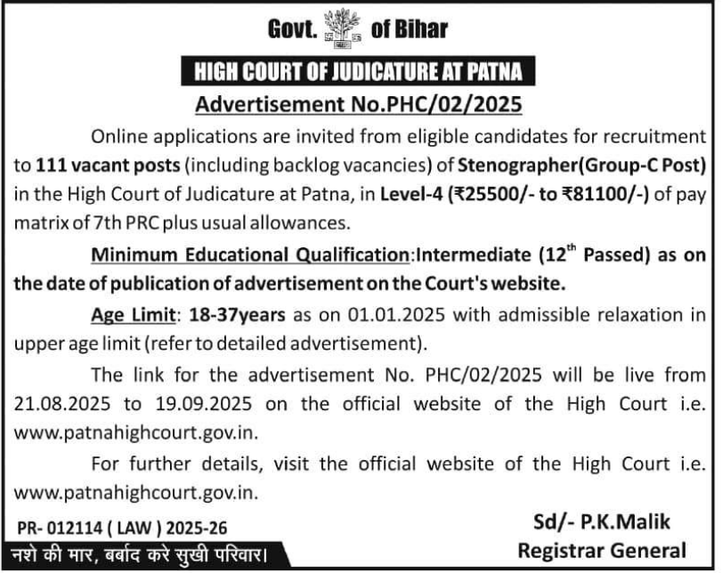 The Patna High Court has released the Stenographer Recruitment 2025 Notification. The High Court of Judicature at Patna, operating under the Government of Bihar, has issued an official announcement to fill 111 vacant Stenographer positions (including backlog) classified as Group-C. Eligible candidates who meet the necessary qualifications are invited to submit their online applications through the official Patna High Court website. The online application portal will be open from 21st August 2025 until 19th September 2025.