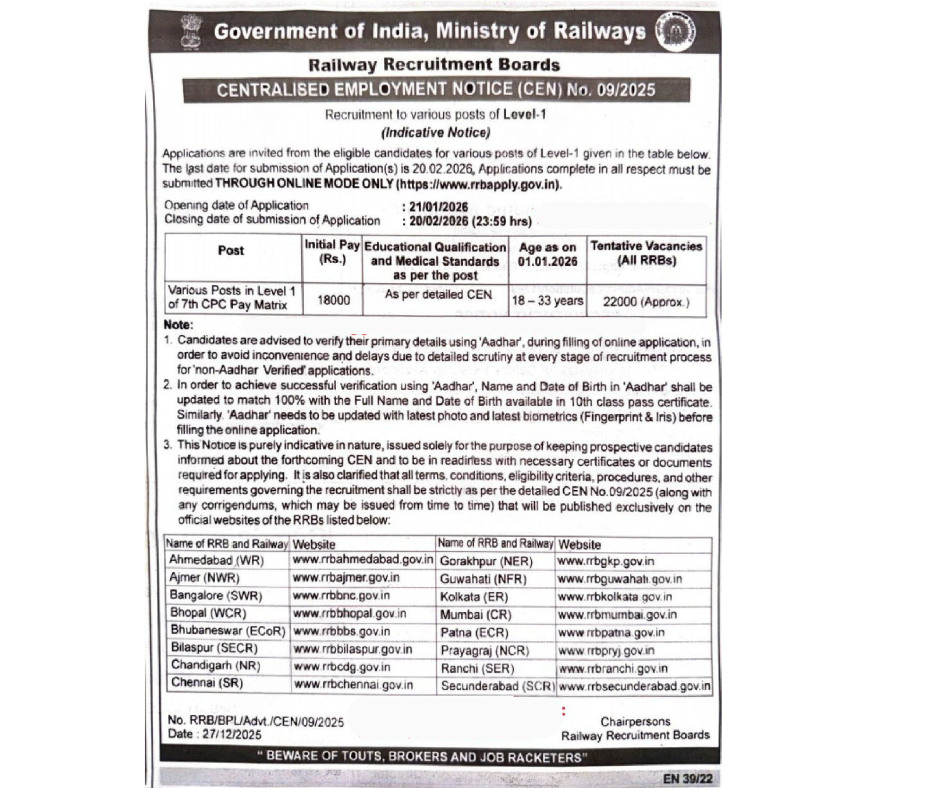 The RRB Group D Notification for 2026 has been issued, providing an indicative notice regarding various Level-1 Railway positions, as published in the Employment Newspaper on the 27th of December, 2025. The Railway Recruitment Boards (RRB), under the Ministry of Railways, has announced a brief notice concerning the RRB Group D Recruitment 2026 (CEN 09/2025), aimed at filling approximately 22,000 Level-1 positions across different zones within Indian Railways. Candidates who have completed their 10th grade or possess an ITI qualification are invited to submit their applications online from the 21st of January, 2026, until the 20th of February, 2026, via the centralized portal.