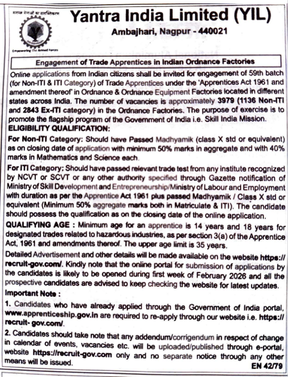 Yantra India Limited (YIL), based in Nagpur, is inviting online applications from qualified Indian citizens for the recruitment of the 59th batch (for Non ITI and IT Category) of Trade Apprentices under the ‘Apprentices Act 1961 and its amendments’ in Ordnance and Ordnance Equipment Factories situated in various states throughout India.